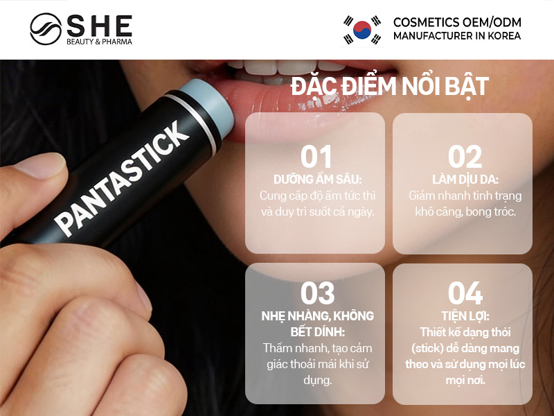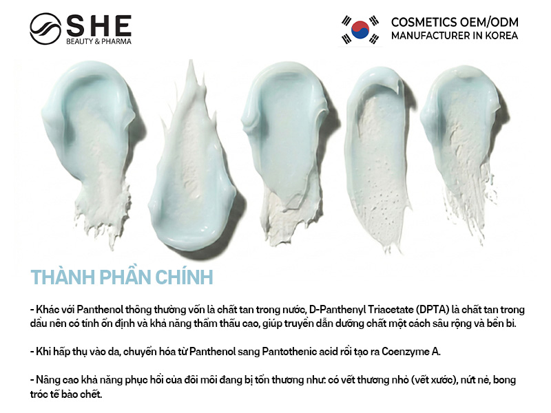 Tại SHE, khi khách hàng muốn gia công son dưỡng môi phân khúc cao cấp, chúng tôi đề xuất ứng dụng D-Panthenyl Triacetate (DPTA) lấy cảm hứng từ công thức của Pantastick Balm. Đây là hoạt chất đột phá được ứng dụng rộng rãi trong các dòng dược mỹ phẩm phục hồi nội địa Hàn: